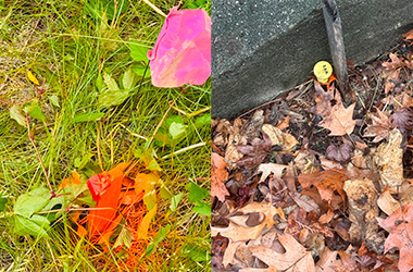 Physical marking of property boundaries using stakes or markers, allowing owners and contractors to clearly identify lot limits for fences, additions, and site work.